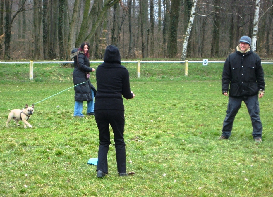 Während des ersten Tages haben wir nähere Angaben dazu bekommen, wie wir mittels unsere Körpersprache richtig mit Hunden kommunizieren können. Eine zentrale Bedeutung hatte dies bei den Rückrufübungen. Wie lade ich den Hund mittels gezielter Körperhaltung dazu ein, zu mir zu kommen, anstatt ihn durch eine, für ihn abwehrende Position in einen Konflikt zu bringen?