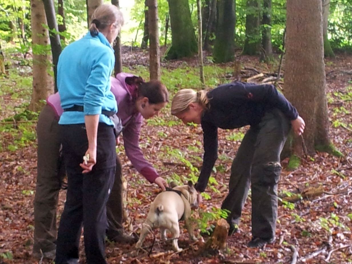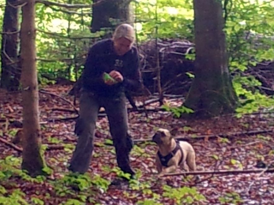 Kurz danach kam dann auch Jaspers großer Einsatz: Marion, Daniela und co. wollten dann mal austesten, wie gut sich Jasper als Rettungshund eignen würde und er durfte an diesem Teil des Trainings teil nehmen. Fremde Personen sind für ihn sowieso immer genial und ihn zu motivieren ist sicherlich eine der leichteren Übungen. Erst ist er mit Daniela zusammen durch den Wald geflitzt. Nach einer kurzen Zeit habe ich ihn dann am Geschirr festgehalten, während Daniela immer noch quietschend von ihm weggelaufen und sich irgendwo in Sichtweite versteckt hat. Jasper hat dann von mir das Kommando „Such!“ bekommen und ist ihr schnurstracks auf geradem Wege hinterhergeflitzt als gäbe es kein Morgen mehr. Es hat ihm und mir so viel Spaß gemacht. Und auch die komplette Mannschaft war begeistert von der Einsatzbereitschaft und der Freude, mit der Jasper dabei war! Ein Bully bei der Rettungshundeprüfung, DAS wäre doch mal was! 😉