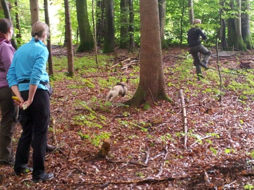 Bei der Flächensucharbeit läuft der Hund frei und sucht ein abgestecktes Gebiet mit Hilfe seines Hundeführers ab. Dabei sucht er nach unspezifischen Personen, in diesem Fall in einem Waldgebiet. Er wird dabei immer wieder vom Hundeführer unterstützt und in verschiedene Richtungen geschickt, motiviert und verbal bestätigt. Die große Belohnung in Form von einer Leckerlie-Dose bekommt der Hund vom „Opfer“, nachdem er es erfolgreich aufgespürt und durch Bellen angezeigt hat. Der Hund darf das „Opfer“ nicht mehr verlassen und soll möglichst bellend bei ihm warten, bis der Hundeführer ankommt. Durch die Belohnung und das anschließende Bespaßen des Hundes durch das „Opfer“ lernt der Vierbeiner, dass es sich für ihn lohnt, während der Arbeit eine fremde Person im Wald aufzuspüren und anzuzeigen und dass das etwas ausgesprochen Tolles ist. Beeindruckend war für mich auch zu sehen, dass die Hunde das sehr wohl unterscheiden können, ob sie im Wald arbeiten, d.h. Personen suchen sollen, oder ob sie dort normal spazieren gehen. Unterstützt wird dies durch ein Arbeitsgeschirr, das nur bei der Suche angelegt wird wie auch durch spezifische Rituale und ein Einsatzkommando, das von Hund zu Hund, wie auch von Hundeführer zu Hundeführer verschieden ausfallen kann. Man kann sehr gut beobachten, wie die Hunde dann regelrecht in den Arbeitsmodus umschalten. Die Hunde arbeiten dabei zeitweise sehr selbstständig, deswegen ist es wichtig, dass der Hund sich auch mal von seinem Menschen lösen kann. Das ist nicht immer so einfach und sicher auch ein Thema, bei dem rassespezifische Besonderheiten mitspielen. Dazwischen durfte ich dann auch mal „Opfer“ spielen und es mir auf der Iso-Matte hinter Büschen gemütlich machen. Auch eine sehr spannende Sache.